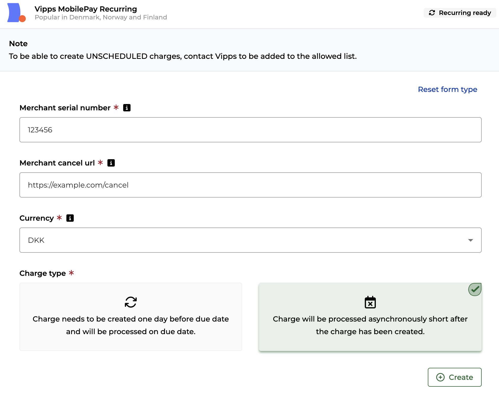 Vipps recurring also supports unscheduled charges. Select this option on the agreement to use unscheduled changes. Note that this needs to applied and approved by Vipps before it can be used.